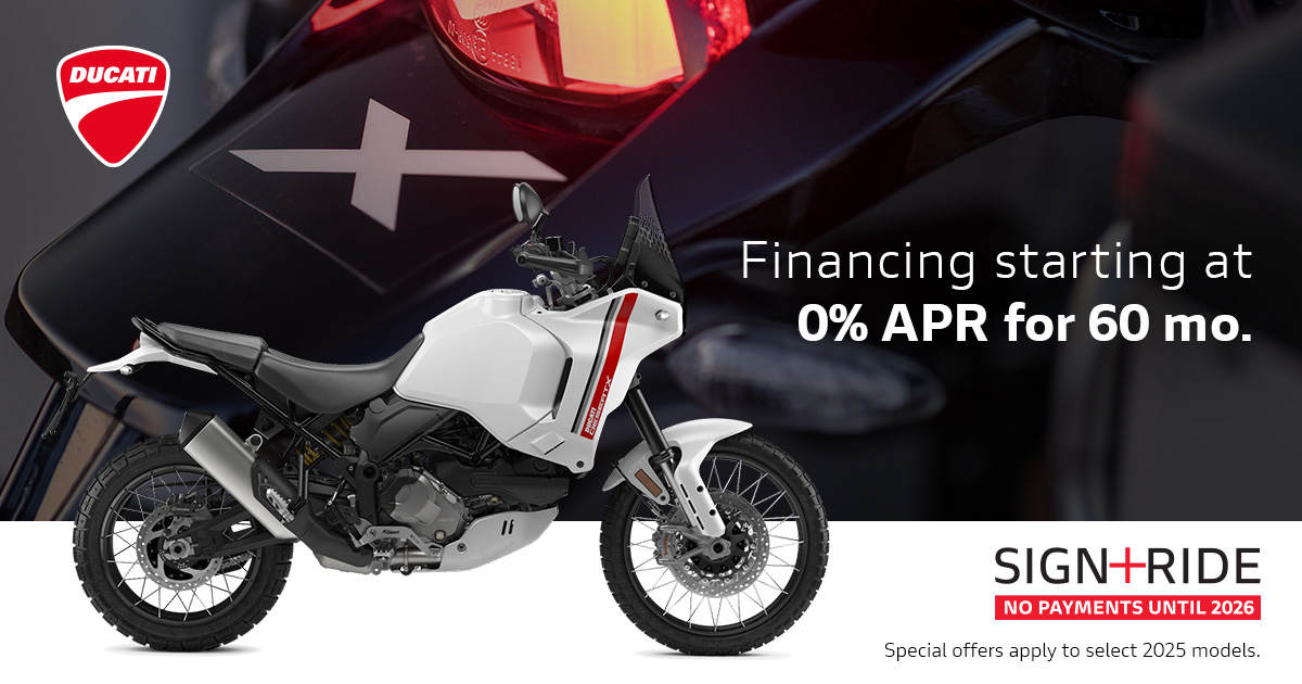 Offer available on select 2024 and 2025 models to highly qualified customers on approved credit by Ducati Financial Services through participating and authorized Ducati dealers from October 1 - 31, 2025. Down payment requirement varies from 0%-25% of the purchase price based on credit worthiness. Not all customers will qualify for the advertised APR. Minimum amount financed is $5,000. See your local Ducati dealer for financing details or, for general product information, call 1-888-391-5446. VW Credit, Inc. dba Ducati Financial Services is a servicer for VCI Loan Services, LLC. © 2025 Ducati North America.